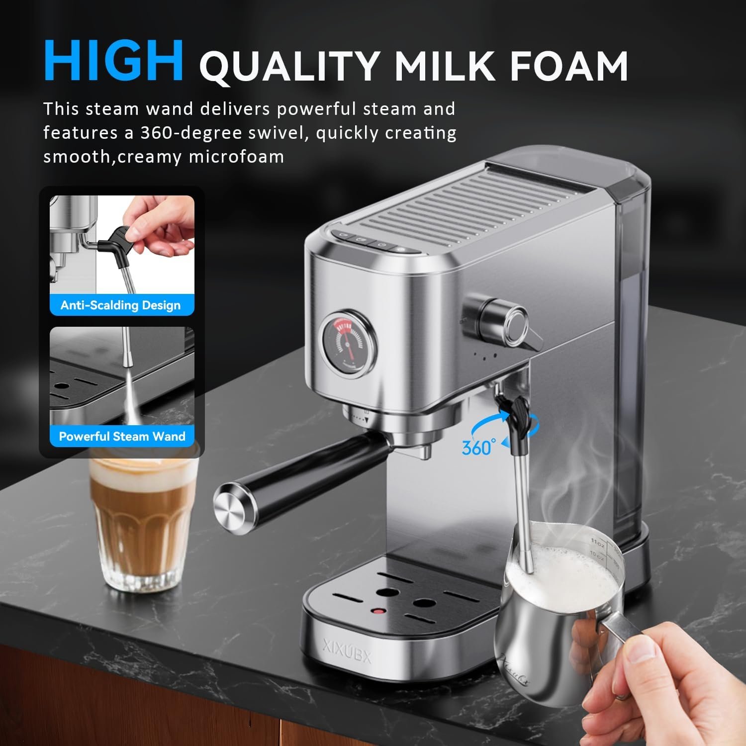 Enhanced Steam Wand with Reliable Performance & Easy Maintenance Equipped with an upgraded steam wand designed for denser microfoam and consistent steam output. The 360° adjustable, detachable nozzle allows for precise control and easy cleaning. Critical Reminder: To prevent clogging and ensure performance, always purge the wand before use and clean it immediately after each steaming session