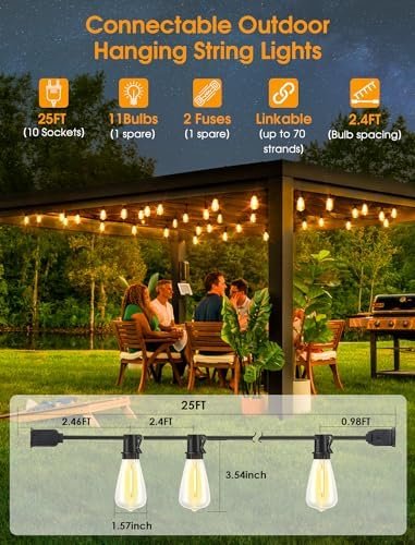 Summer Garden Patio Ambiance Lights: Perfect for garden, patio, backyard, gazebo, balcony, tent, pool umbrella, cafe, bistro, camping, party, festival, wedding, birthday, Christmas, holiday to create a cozy ambiance. Package including 1 pack of 25 ft 10 sockets string lights, 1 spare bulb, 1 user manual. The spacing from the plug to the first bulb is approx. 2.46 ft, and the bulb spacing is approx. 2.4 ft