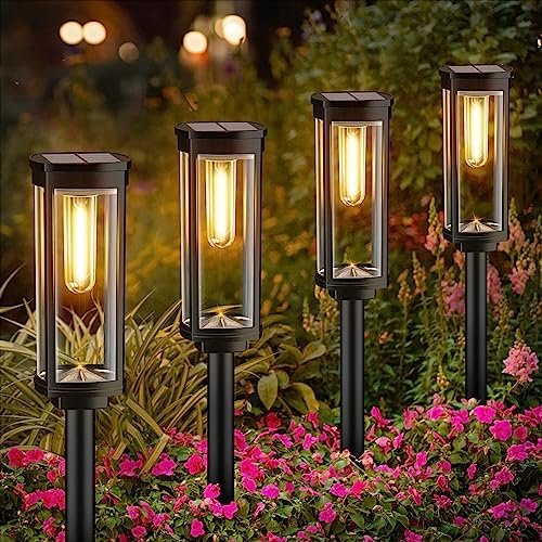 UNIQUE & RETRO DESIGN: The bright solar pathway lights outdoor feature warm white tungsten filament bulbs placed within high transparency, thicker lampshades, making BITPOTT solar yard lights brighter and more durable than others. These waterproof solar powered landscape lights can project unique light and shadow, creating a romantic and warm atmosphere for your home.