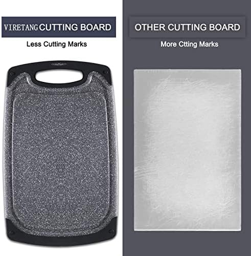 Built in Juice Grooves and Reversible: Juice groove along the border can help catching the juices from meat, fruit, or vegetable when cutting on Viretang cutting board so that they won’t spill on your kitchen countertop. Double sided design, one side with juice grooves for catching juices, another side has more space for cutting.
