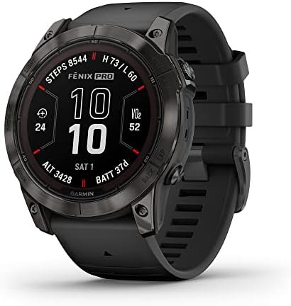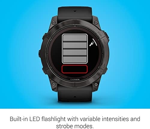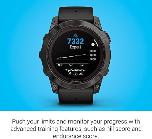 fēnix® 7X Pro Sapphire Solar is the ultimate multisport GPS smartwatch with a large 1.4” display, designed to perform all day, every day. Get weeks of battery life with the scratch-resistant Power Sapphire™ solar charging lens. Meet any challenge with advanced training features such as hill score, which measures your climbing performance over time, and real-time stamina updates to gauge your stamina potential. For a more complete picture of your health, training and recovery, tap in to 24/7 health and wellness monitoring with advanced sleep tracking, HRV status, Pulse Ox and more (this is not a medical device, and data presented is intended to be a close estimation of metrics tracked; Pulse Ox not available in all countries). When the sun sets, use the LED flashlight to stay visible or find your way. Navigate with preloaded TopoActive maps and ski resort maps; download even more regions for global adventures. Adventure far off the grid with up to 37 days of battery life in smartwatch mode with solar charging in 3 hours of direct sunlight (50,000 lux) per day. Gain superior positioning accuracy while optimizing battery life, thanks to multi-band GPS with SatIQ™ technology.