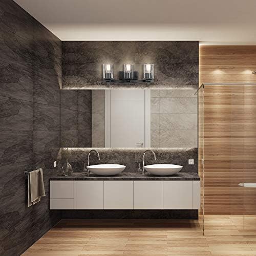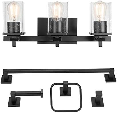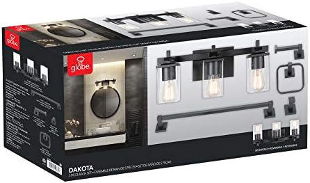 Globe Electric 51634 5-Piece All-in-One Bathroom Accessory Set, with Vanity, Matte Black, 3-Light Vanity Light, Seeded Glass, Towel Bar, Toilet Paper Holder, Towel Ring, Robe Hook, Home Improvement