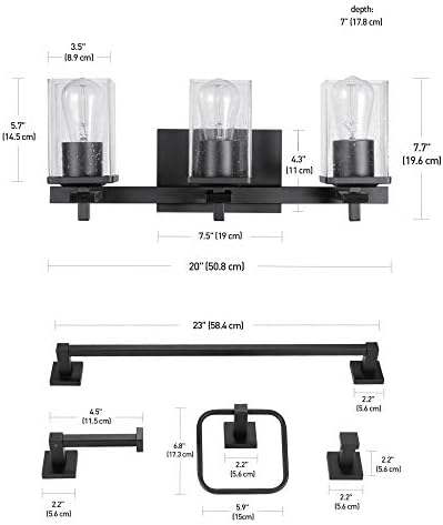 MEASUREMENTS: Towel Bar: 23.01″ W x 2.7″ D. Towel Ring: 5.91″ W x 6.82″ H x 2.76″ D. Robe Hook: 2.21″ W at the base x 2.76″ D. Toilet Paper Holder: 6.50″ W x 2.9″ D. Vanity: 20.02″ W x 7.68″ H x 7.13″ D. Shades: 3.55″ W x 5.7″ H x 3.55″ D