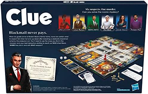 Who killed Boddy Black? Solve the mystery in this suspenseful Clue board game! When 6 guests arrive at Boden Black’s mansion, none are certain what to expect. But when their host turns up dead after revealing a sinister blackmail scheme, the pressure is on. Race against the other players to crack the case by gathering clues and narrowing down choices. Each player tracks their clues in a detective notepad and eliminates information to sleuth out who killed Mr. Black, where in the mansion they did it, and what weapon was used. Roll a magnifying glass icon? Draw a Clue card to add to the intrigue! A player might open a new secret passage or get to name a weapon they want revealed. Be the first to make the correct accusation and win the game! This Clue murder mystery game is beautifully reimagined with a dazzling cast of characters, luxurious setting, and fresh storyline. It’s a fun game for families, friends, mystery fans, and kids ages 8 and up! Clue and all related characters are trademarks of Hasbro.