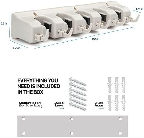 HOME IT Mop And Broom Holder – Garage Storage Systems with 5 Slots, 6 Hooks, 7.5lbs Capacity Per Slot – Garden Tool Organizer For 11 Tools – For Home, Kitchen, Closet, Laundry Room – Off-White
