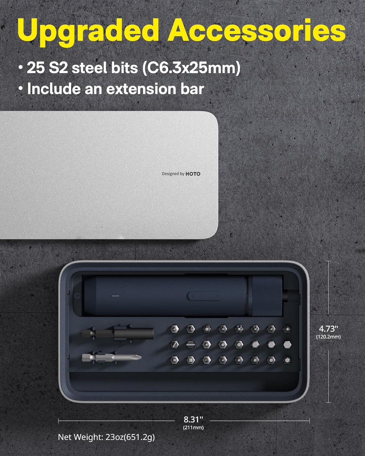 Complete All-in-One Set: Includes 1 electric screwdriver, 1 extension rod (60mm), 24 S2 bits (C6.3 x 25mm), 1 PH2 extended bit (C6.3 x 50mm), and 1 magnetic storage case. A well-designed toolkit that combines practicality with a sleek modern appearance. Note that charging cable is not included
