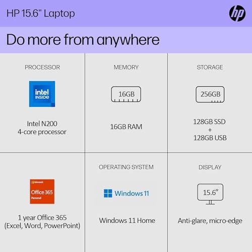 HP Newest Essential 15.6″ Laptop, Intel N200 4-Core Processor, 16GB RAM, 256GB Storage (128GB SSD+128GB WOWPC USB), WiFi 6 & Bluetooth, HDMI, Battery Life Up to 11hrs, Windows 11, 1 Year Office 365