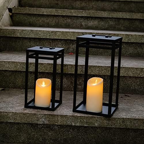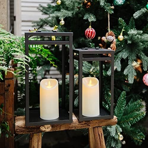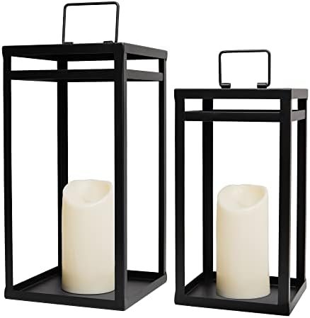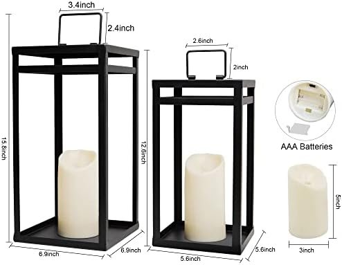 【Dimensions】:Our lanterns decorative are elegantly crafted of chunky sturdy black metal, with a beautiful open design. They are eye-catching lanterns decor for indoors and outdoors. And it’s more stable than other lanterns due to the wide base. Including the handle, the large one measures 6.9×6.9×15.8 inch, the handle is 3.4×2.4 inch, the small one measures 5.6×5.6×12.6 inch,the handle is 2.6×2 inch. The included 2 candles measure 3x5inch. Each candle requires 3 AAA batteries(NOT included).