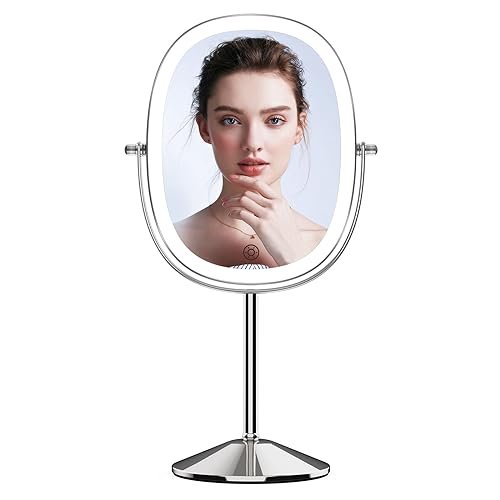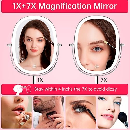 【1X/7X Magnifying Mirror HD】:This double-sided led mirror makeup makes it easier to get the perfect makeup look, 1X for daily use and hair styling, 7X magnifying mirror for detailed makeup, contact lens wear, skin care, shaving and applying mascara. Enjoy detailed makeup and skin care! Warm tips: when using the 7X magnifying makeup mirror, please keep your face 4 inches away from the mirror to avoid dizziness.