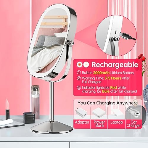 【Rechargeable Makeup Mirror】:This light up makeup mirror is equipped with 2000 mAh rechargeable lithium battery, high capacity lithium battery provides longer usage time without frequent charging, convenient for you to travel with. Type-C cable included (charger not included). Warm tips: the mirror can’t be charged suggest replacing the unused adapter to try.