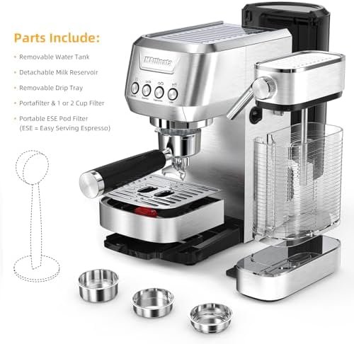 【User Friendly】49oz water tank is removable for easy filling or cleaning. The removable drip tray makes it easier to rinse, and the higher cups can be used to make larger cups of coffee. Detachable milk reservoir can be placed in the refrigerator to keep milk fresh in-between uses. MAttinata coffee maker comes with espresso maker*1, milk reservoir*1, water tank*1, single-cup filter*1, double-cup filter*1, ESE filter*1, 51 mm portafilter*1, coffee spoon with tamper*1.