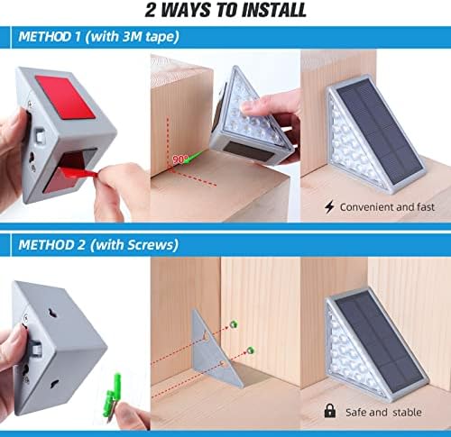 13 LEDs & Super Bright:Differ from other solar stair lights,NIORSUN outdoor stair lights use more (13LEDs) and high-quality lamp beads,with a highly concentrated light bead lens to provide excellent and bright lighting.The larger rectangle shape of solar panel is a nod to the triangular shape of step lights,to capture as much sunlight as possible.The solar deck step lights only need 4-5 hours of charging during the day,and can achieve 8-10 hours of full brightness lighting at night.