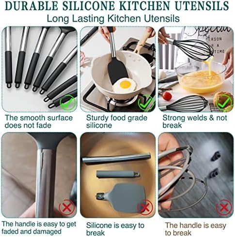 Silicone Cooking Utensil Set,Umite Chef Kitchen Utensils 15pcs Set Non-stick Heat Resistan BPA-Free Stainless Steel Handle Tools Whisk – Grey