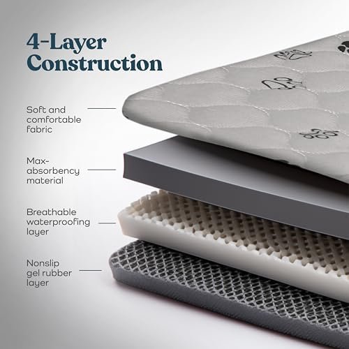 4-Layer Construction – The outer layer is supremely comfortable and soft, covering a highly absorbent second layer. The inner layer is of a breathable, waterproof material, and the bottom is a nonslip gel fabric that won’t slide even with a wiggly dog.