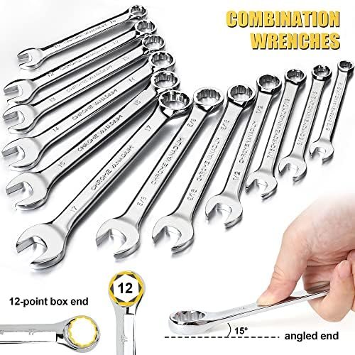 The mechanics tool set includes 50pcs metric and SAE drive sockets with corresponding 1/4-inch and 3/8-inch reversible drive ratchets, 2pcs extension rod, 2pcs adaptor, 2pcs spark plug sockets , 20pcs drive nuts, 12pcs combination wrenches and so on. It is a complete set of home tools to solve you a lot of trouble in your daily maintenance. Whether it is furniture assembly or automotive repair tasks, it will be your good partner.
