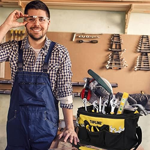 16-inch tool bag with wide mouth design makes it easier to take out and put back tools. The bottom of the bag is made of hard plastic material to water resistance and durability. 6 pockets on the inside of the bag for convenient to organize tools, 3 pockets on the outside of the bag for convenient to take. Adjustable shoulder strap and padded hand strap for easy carrying.