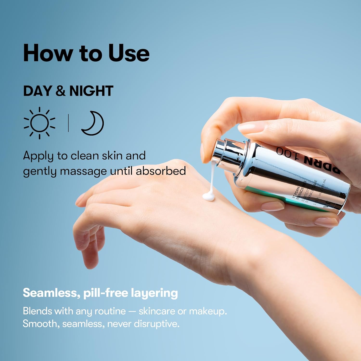 [ALL-DAY ELEGANCE] Experience our swiftly absorbing, unscented essence, perfect for use at any time of day or night. It delivers enduring radiance and improves your skin’s elasticity without any fragrance.