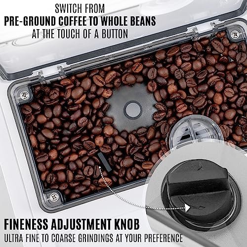 BUILT-IN GRINDER: Bring out the rich and aromatic flavor of coffee beans with this coffee machine with grinder. Make it light or strong by adding coffee beans into the bean hopper (250g capacity) and adjusting the conical burr grinder to achieve coarse grains or fine coffee powder. You can also use pre-ground coffee by putting ⅛ cups of powder into the chute.