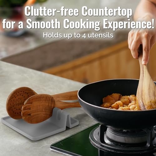 HEAT RESISTANT AND EASY TO CLEAN: Made from food-grade material, this silicone spoon rest can be placed near the stove or countertop without it being affected by heat. It is designed with a non-slip base to prevent it from sliding and causing chaos while cooking. Once you are done with cooking, toss the kitchen tool holder in the dishwasher for a quick cleanup.